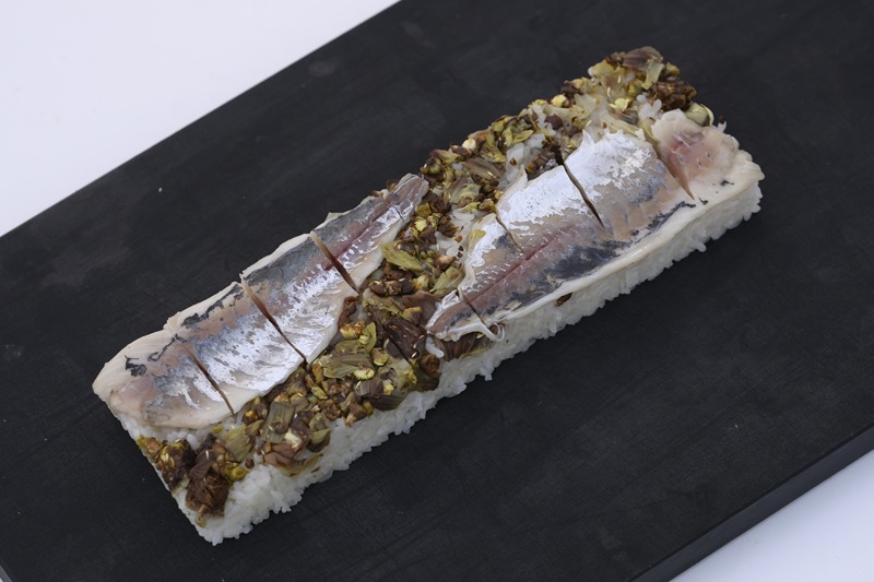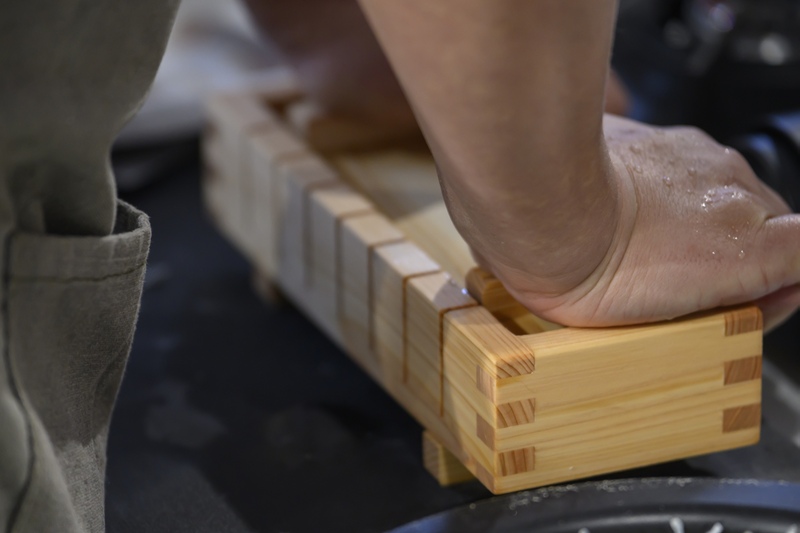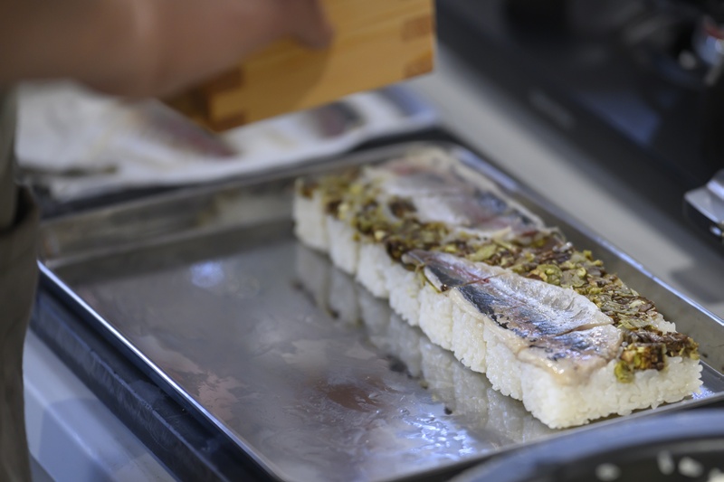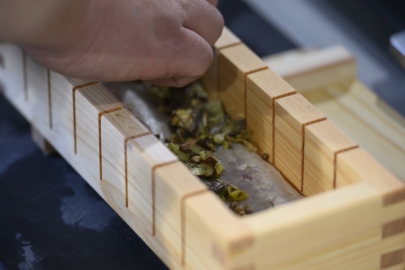 しめた鯵の皮を剥き、押し寿司の型に下処理をした鯵と刻んだ蕗のとうを並べて、上から酢飯を詰めていく。