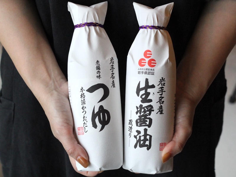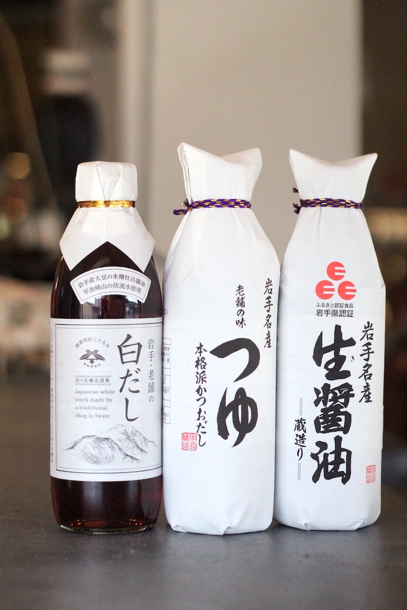 岩手産丸大豆使用の淡口醤油をベースに、厳選したかつお節、日高産昆布から取ったダシをブレンドした白だし。