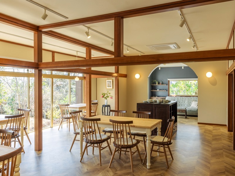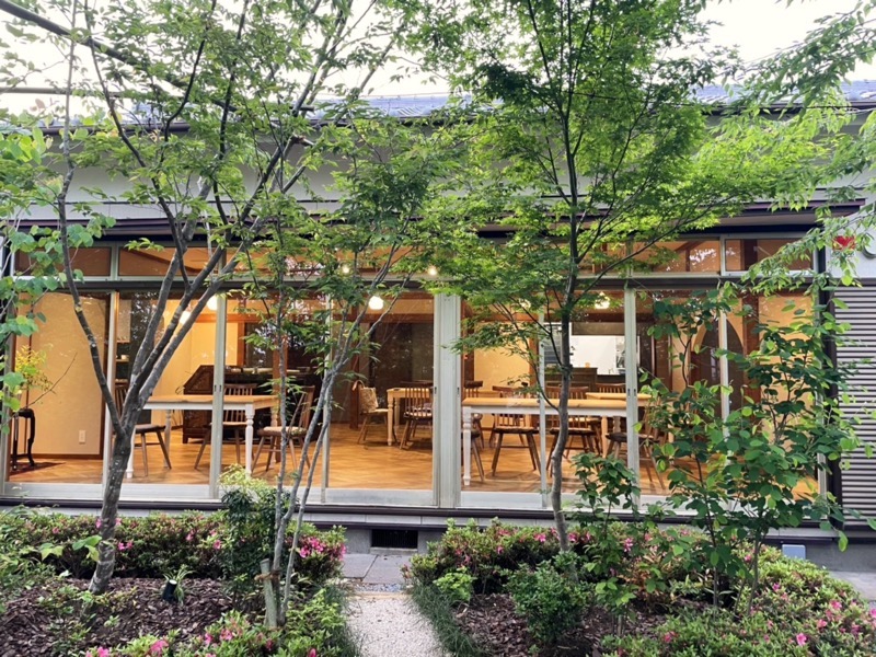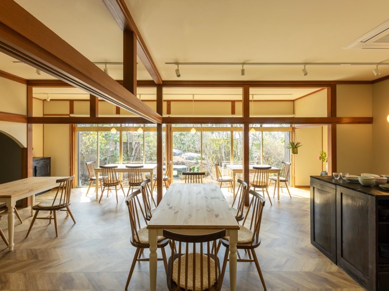 パノラミックに庭園が臨めるよう、もともと縁側だったところを中心にテーブルを置き庭側に向けてイスも配置。事前にご予約いただいた方には、先着順でお庭側のお席をご用意させていただいております。