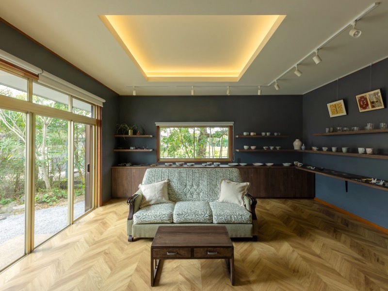 うつわエリアは落ち着いた雰囲気にするため、明るいカフェエリアと比べてシックな壁色に。祖父母時代のソファがまだ使えたので、壁や床の色とマッチする色合いの生地に張り替えました。