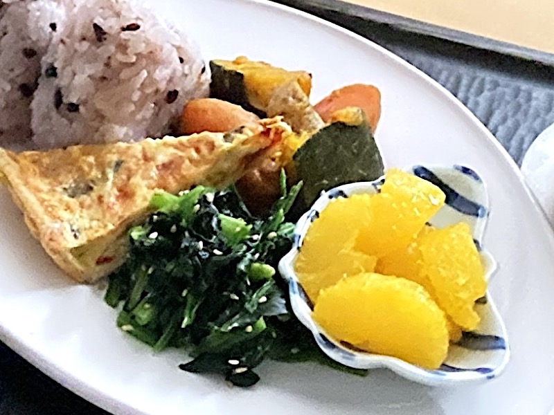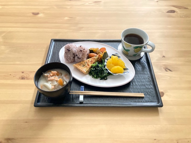 お店の定休日は第1・3日曜、月曜、火曜なので、水曜日は営業初日。よって仕込み作業も多いため朝ごはんも少しだけ早く、またボリュームたっぷりいただきます。今回の献立は、雑穀ごはんのおむすび、茹でほうれん草、母の手製かぼちゃの煮物と鮭粕汁、残り物のキッシュ、ご近所さんからいただいた柑橘、ホットコーヒーです。