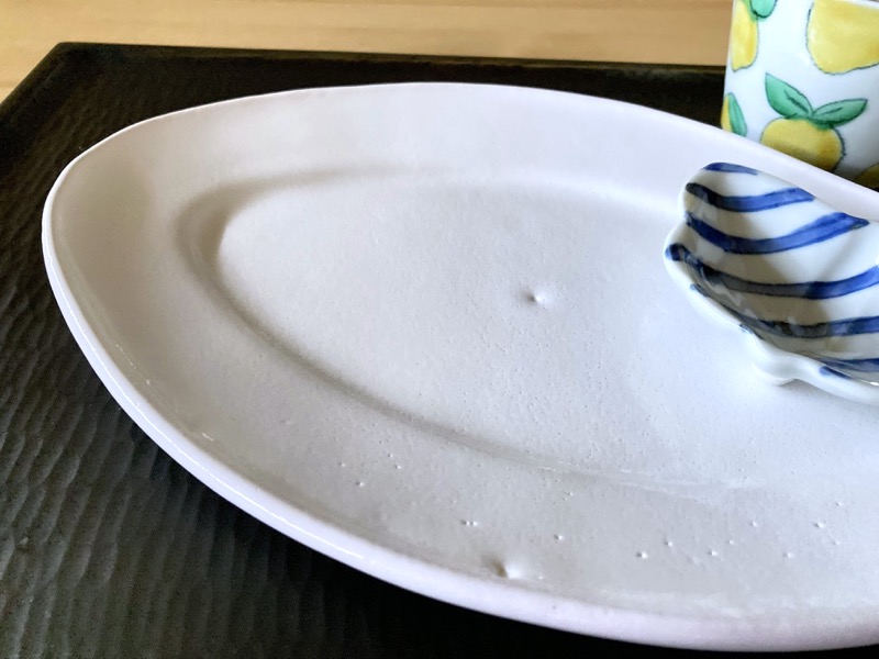 このオーバル皿の中で使っている樋山真弓さんの蝶形の縞文小皿がアクセントに。一見、可愛らし過ぎるかと思いきや、白や黒など単色のお皿と合わせると全体の印象を引き締めてくれます。中に食材を盛れば縞模様はチラ見え程度に収まり、思った以上に気にならないので名脇役としてカフェでも大活躍しています。