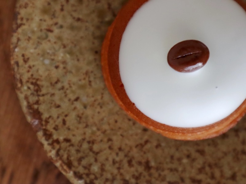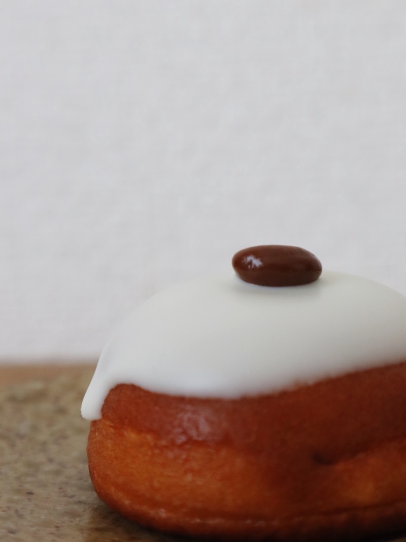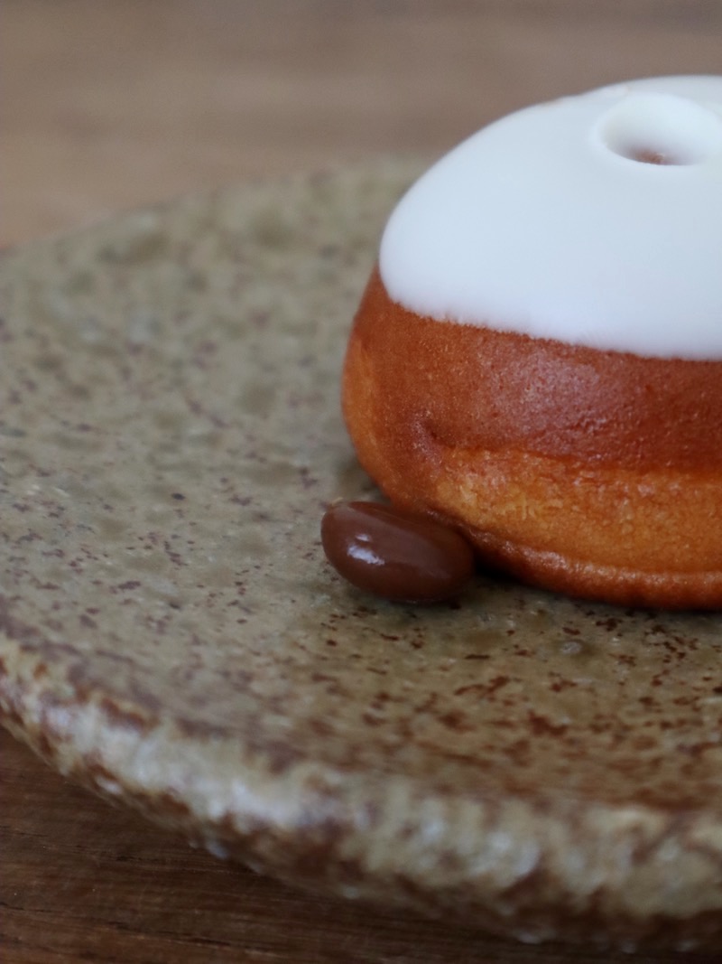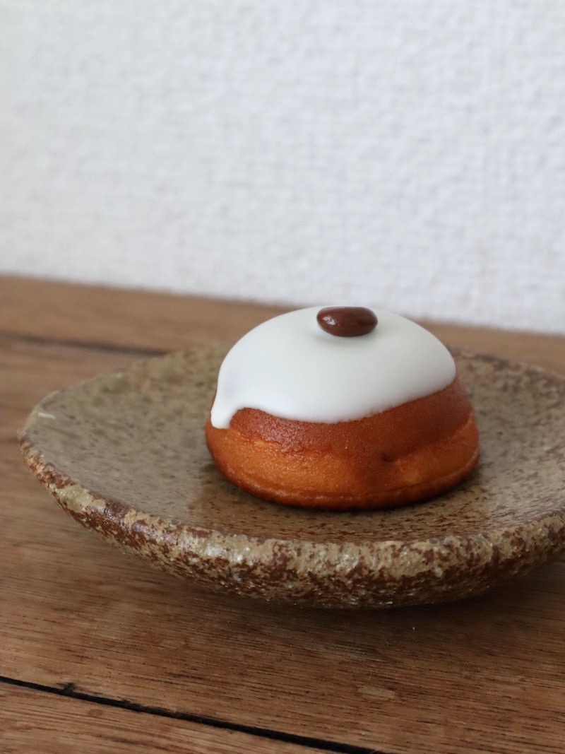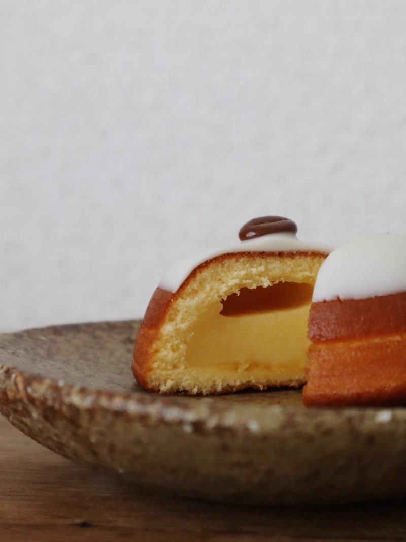 雪化粧した富士山を、そのまま小さくしたようなルックス。カスタードクリームをしっとりとしたスポンジで包み、冠雪した山肌の様子をホワイトチョコで再現。頂上には、コーヒー味のチョコレート豆があしらわれています。