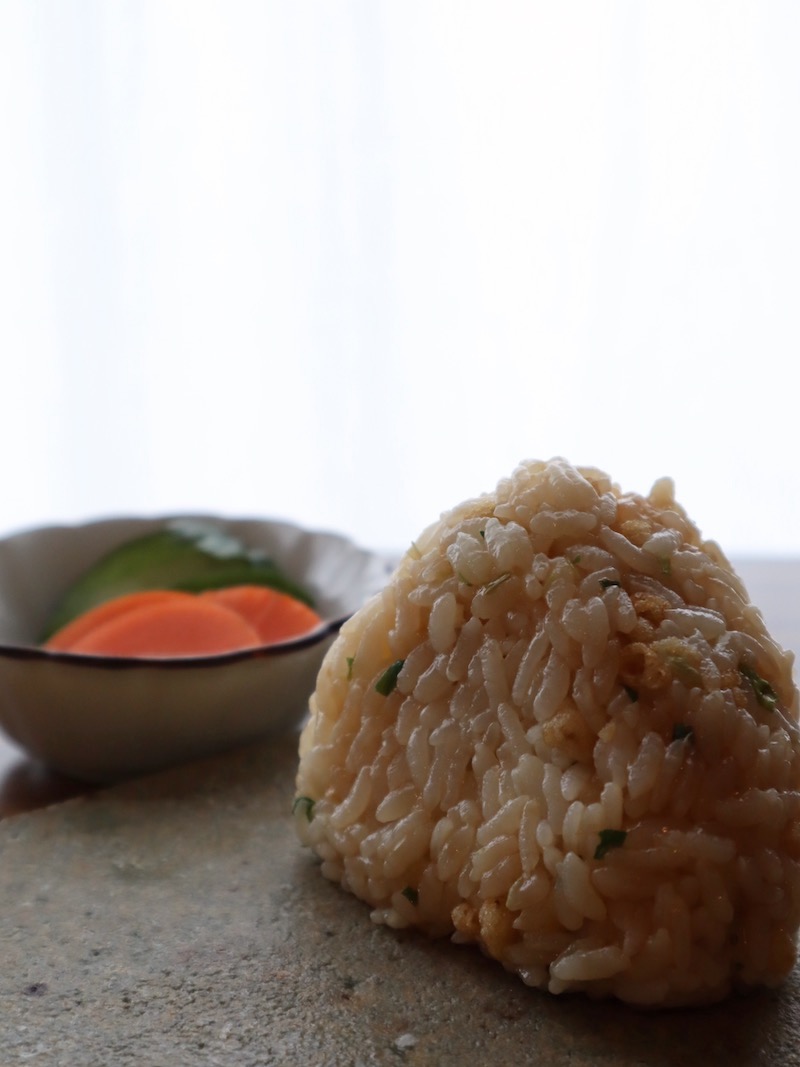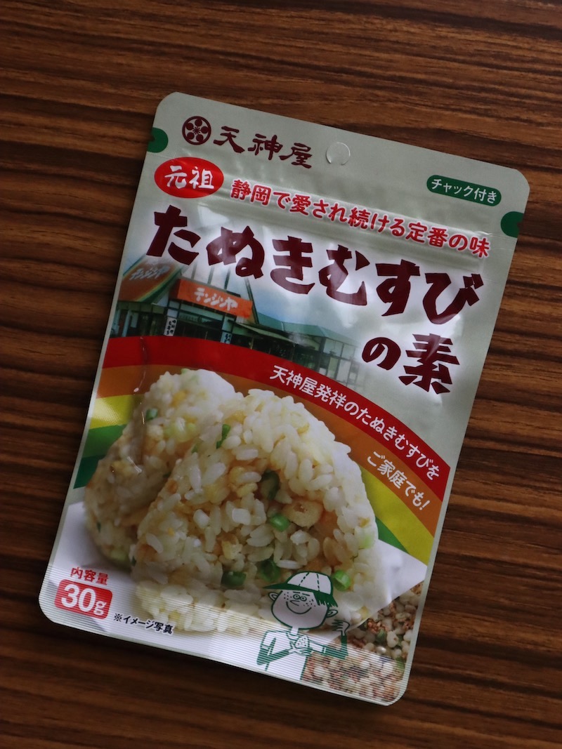 元祖たぬきむすびの素には、天かすとネギ、醤油などが混ざっています。炊きあがったご飯にふりかけて握れば出来上がり。とっても素朴で、しみじみ美味しい。そんな静岡の味が台所で気軽に再現できる、私の生活になくてはならない逸品です。