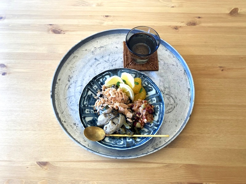 柳川謙治さんの「染付芙蓉手七寸皿」にご飯をよそい、その上に蒸し牡蠣、ほぐした焼き鮭、ランチで余ったキーマカレーになる前の具材を盛った「ごちゃまぜ丼」。口直しに添えたものは、宮崎の美味しい柑橘「日向夏」に刻んだミントをまぶしたものです。