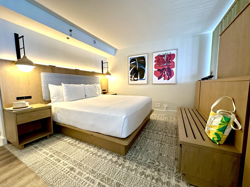新しいお部屋はこんな感じ。シンプルななかにハワイらしさもしっかり感じるのは、壁に飾られたローカルアーティストのグラフィックと、木の温もりゆえ。広々としたベッドの背の向こう側がバスルームです。で、奥の壁の向こう側はどうなっているのかといいますと……。