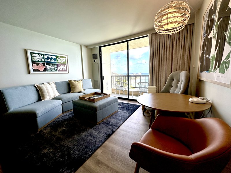 ドーンとワイキキビーチを望む広々としたリビングルーム! 部屋に入って、まずベッドルームの素敵さに「わぁ~♡」となり、その後、ここに足を踏み入れてさらに「わお〜!」となる、びっくり&うれしいが詰まった期待以上の部屋のつくりに、かなり興奮してしまいました。