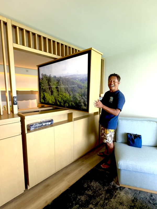回転式の大型テレビを調子に乗って回しすぎたからか、テレビの動きがギクシャクしたのでフロントに連絡すると、フレンドリーなスタッフがなんと3人も駆けつけてくれて、ワイワイ楽しく調整してくれました。ほんと、陽気であったかくていいんですよ〜。こういうときこそまさに、私はあぁ、今、ハワイにいるんだなぁと、しみじみ思うわけです。