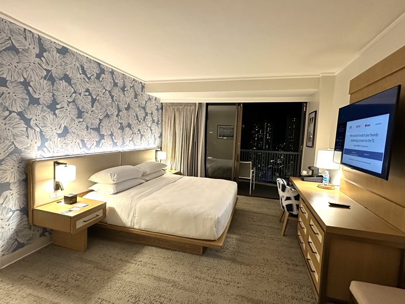 改装は最小限と書きましたが、快適に過ごせる部屋へのリニューアルはきちんと行われています。私が泊まったこの部屋も、改装が終わったばかりだそう。ブルーグレー地にハワイの植物が配された壁紙がはられ、シックで落ち着いた空間になっていました。