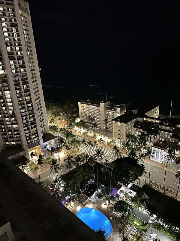 カラカウア通りを挟んでいるといっても、海はすぐそこ。キラキラした光に包まれたワイキキの夜景も楽しめます。目の前には、1901年創業の老舗ホテル「モアナサーフライダーホテル」のお姿も。