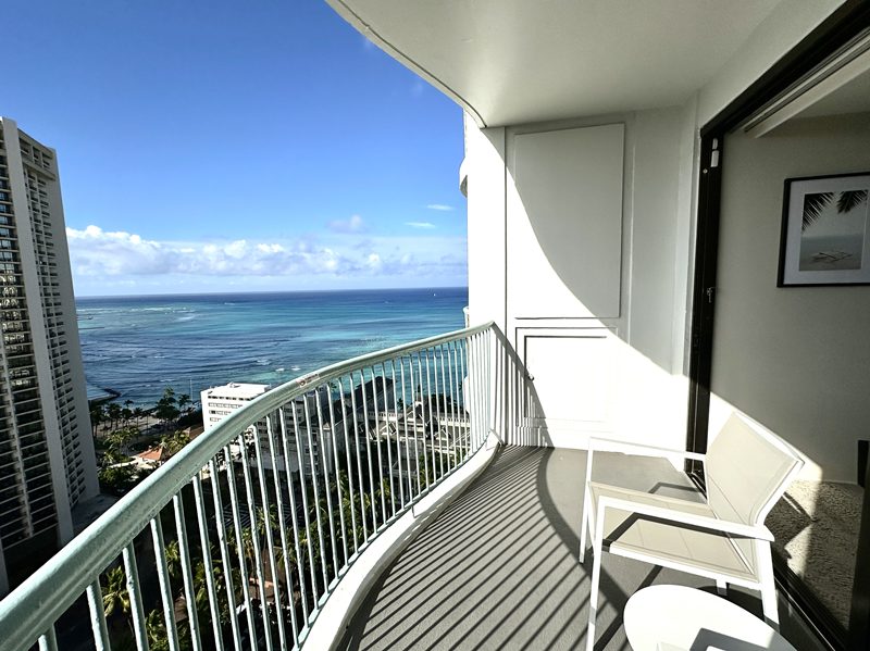 ドーンと広いラナイから広がるワイキキビーチ。眩しい〜〜! それにしてもラナイがもったいないくらい広いので、フルーツを買ってきて、ここで何度か朝ごはんを楽しみました。