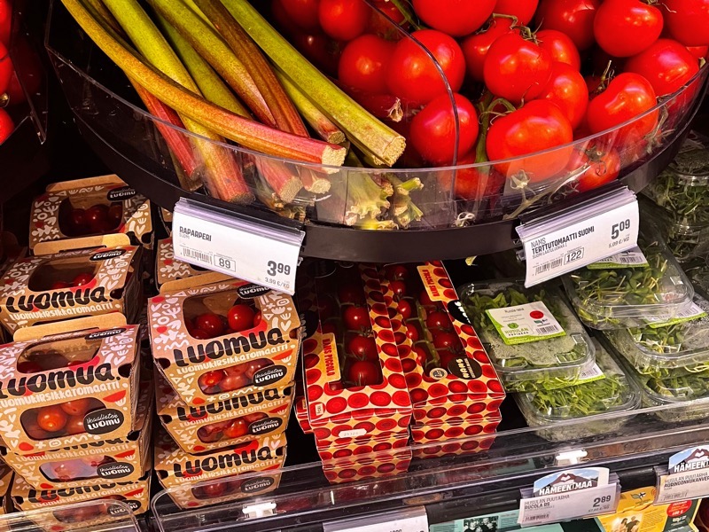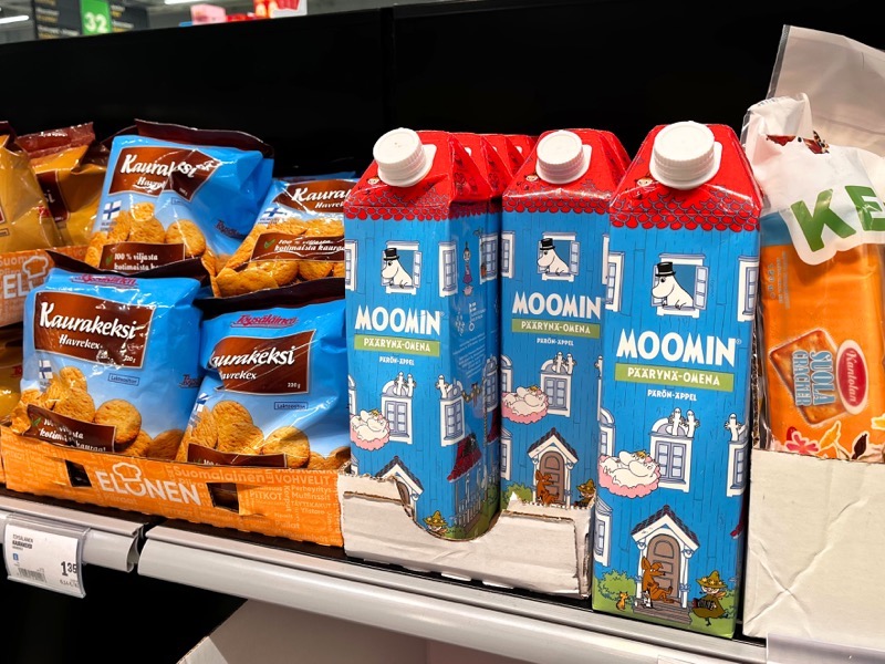 スーパーごとにも特徴があるので、ぜひ何店舗か立ち寄ってみてください。フィンランドならではの商品としては、今年の夏、キツネのデザインのベリー摘み器を見かけました。櫛状の部分にベリーの実を引っ掛けて取る仕組みになっています。また、パッケージに心踊るトマトも初めてで思わず写真を撮りました。その他にもムーミンのパッケージの絆創膏やお菓子、ドリンクなどの商品もたくさん見かけますので、お土産探しにもぴったりです。