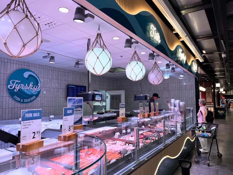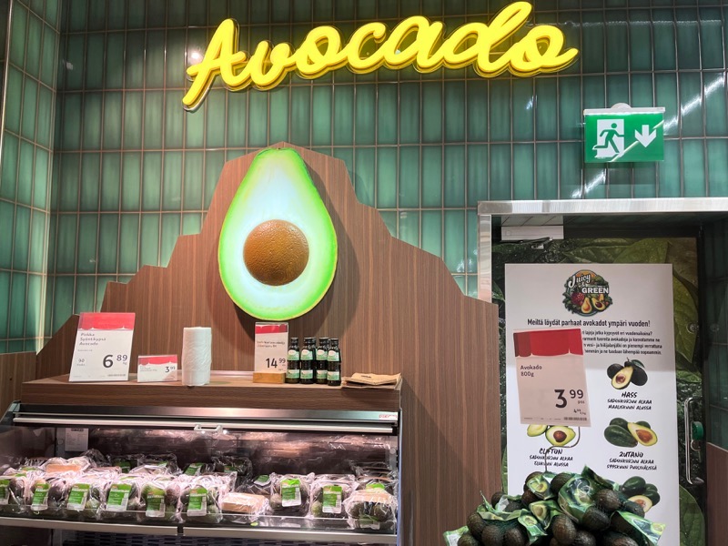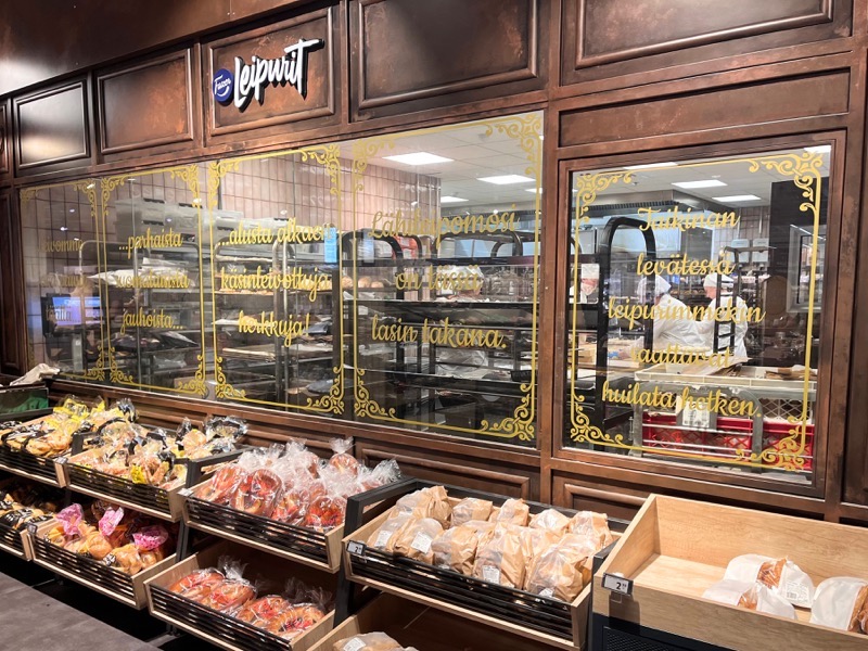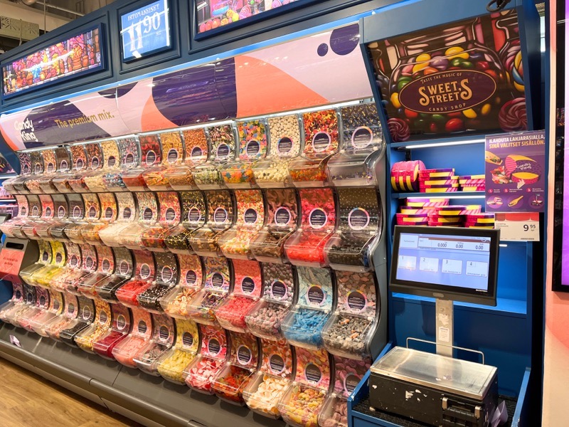 店内の様子を一部ご紹介すると、パン職人さんたちが作っている様子が見えるパンコーナー。ディスプレイもインパクトのあるアボガドコーナー。大きなサーモンの切り身が並んでいる鮮魚コーナー。また、お菓子コーナーは、種類が多くパッケージも色鮮やかでデザインにも富んでいます。フィンランドはグミやチョコなどの量り売りがほとんどのスーパーにあります。お菓子だけではなく、野菜や果物などでも量り売りとなっており、それぞれのライフスタイルに合わせた買い物ができ、アパートメントステイなどにもとても便利です。