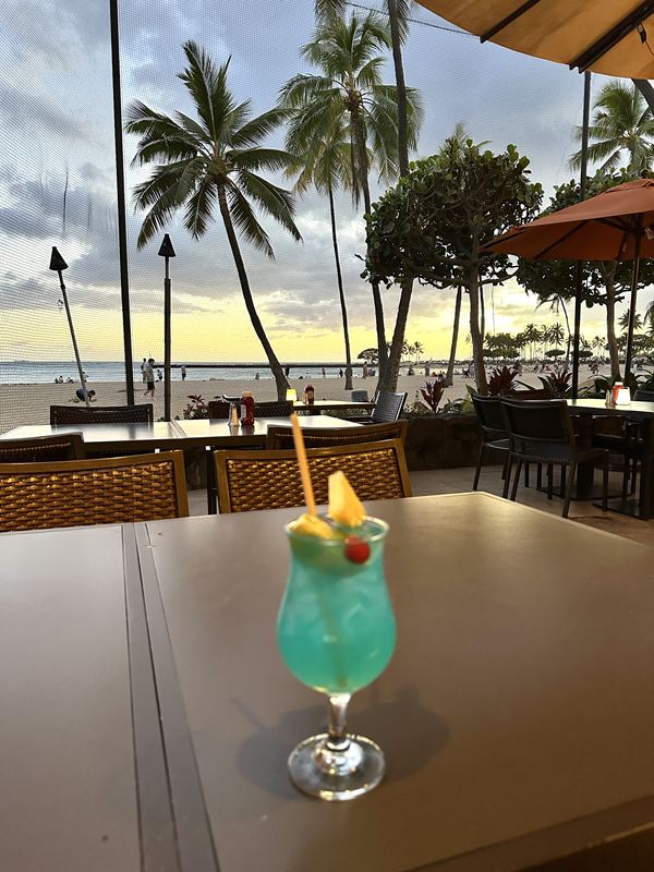 「ヒルトンハワイアンビレッジ」に宿泊中、ルアウショーが開催される曜日以外は毎日、海沿いの「Tropics Bar & Grill」が私たちのダイニングでした。ヒルトンといえば飲まずにはおれないカクテル“ブルーハワイ”をお供に、毎日いろいろなメニューに舌鼓み。ワイキキに沈む夕陽を眺めながら、エルビスのことを想いつつのブルーハワイは、本当最高でした!
