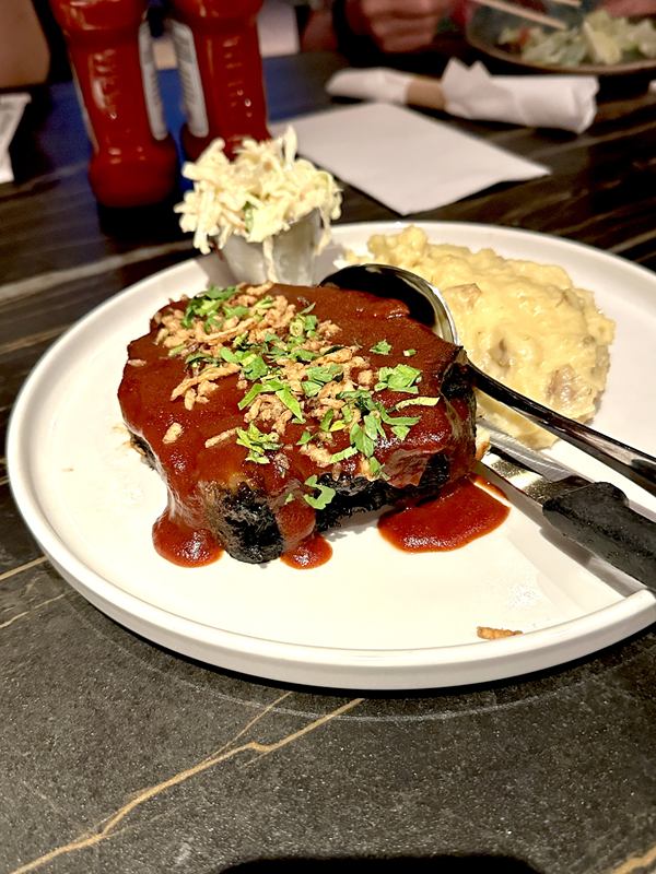 これは何度もリピートしたお気に入りのメニュー“Slow Kiawe Smoked Beef Brisket”($48)。スモークしたブリスケ(牛肩バラの前足の内側、胸部あたりの肉)という希少な肉をキアヴェの木でスモークし、自家製バーベキューソースにクリスピーなオニオンをちらし、ガーリックマッシュポテトを添えた濃厚なひと皿。