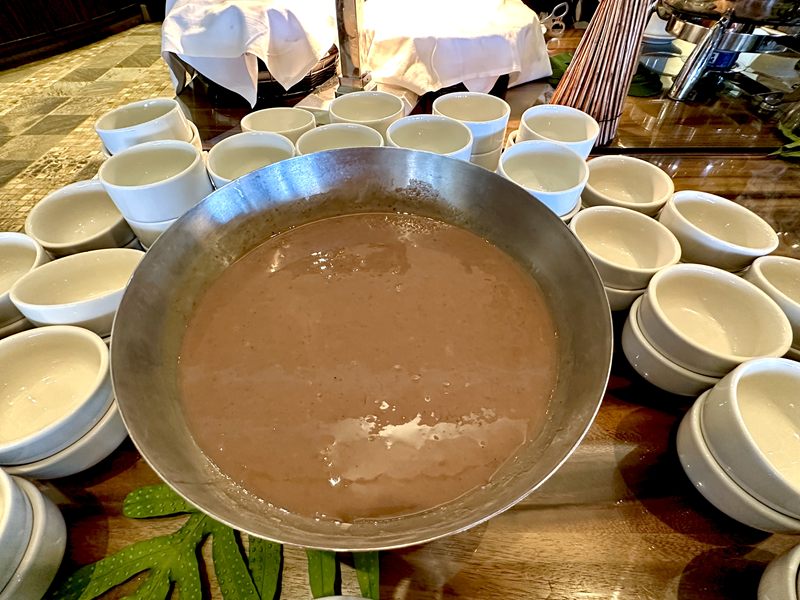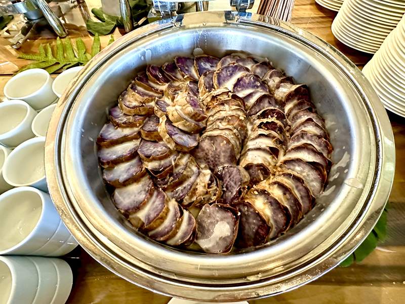 さて、肝心のブッフェですが、見てください、この迫力! こんな大きなボウルにドーンといっぱい入ったポイ(タロイモをたたいて粘り気が出るまでつぶし、ペースト状にしたもの)は初めてです。