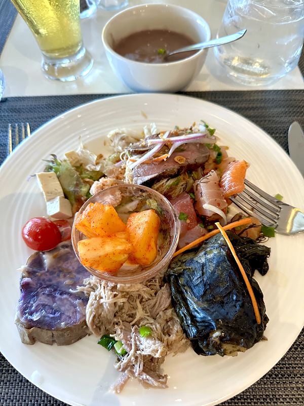 タロの葉で豚肉を包んだラウラウや、ココナッツグレーズがかかったスイートポテト、12時間スモークしたピピカウラ、カルーアピッグ、チキンロングライス、ポケなど、ハワイアンフードがずらり。これで1人$85。コースを食べることを考えたらとってもお得! でした。