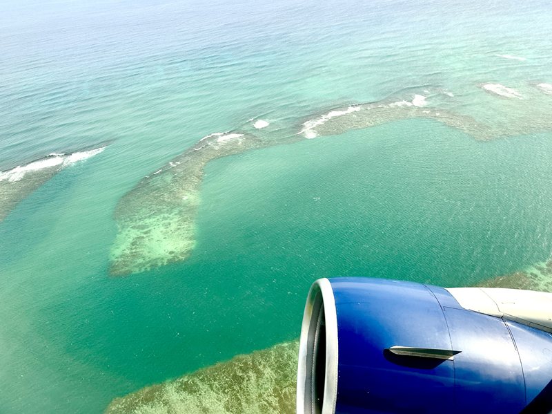 行きと帰りでは、飛行機から見る海の近さも違いますよね。こちらは帰りの離陸後の景色です。また、乗っているときの気持ちも違っていて、どちらも好きですが、やっぱり行きの、来た来た! というワクワク感のほうが勝るかなぁ。