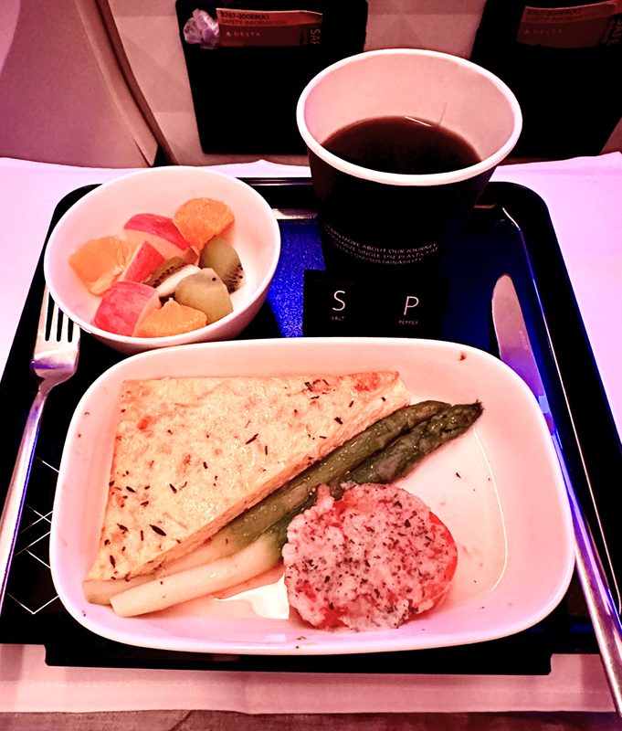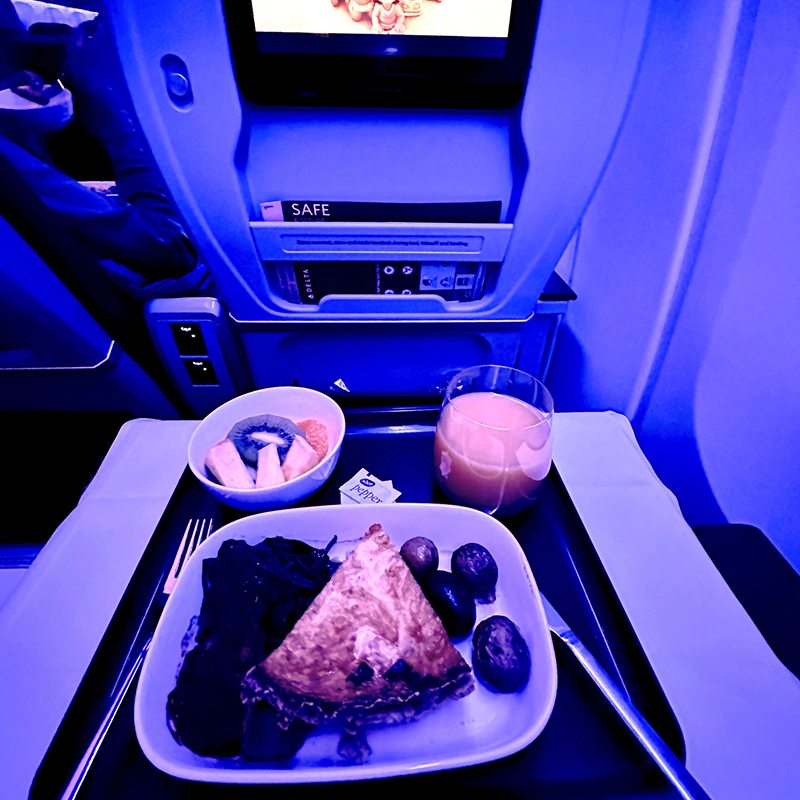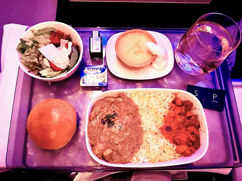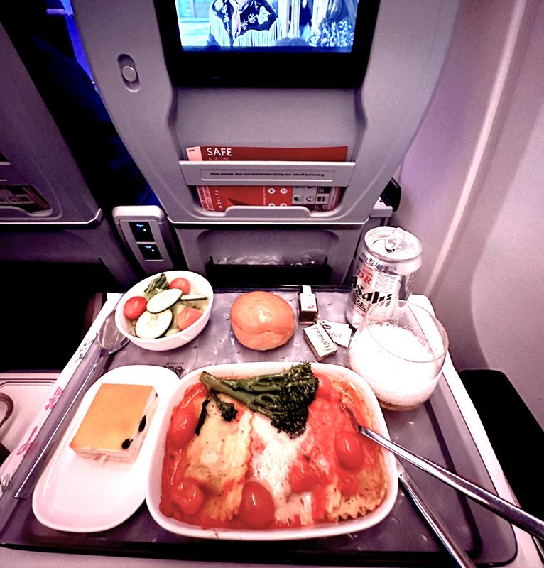 機内食はどんな感じだろうとワクワクしていましたが、これがもうビジネスクラス並みのサービスで、こちらが恐縮してしまいました。味も量も申し分なし。とってもおいしくて、こんな満足度の高い機内食は正直久しぶりでした。