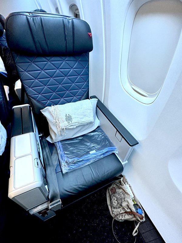 「デルタ・プレミアムセレクト」を侮っていました。すいません! 今まで乗ってきた他社のプレミアムエコノミーとは、こちらは雲泥の差でした。見てください、シートのゆったり感を!