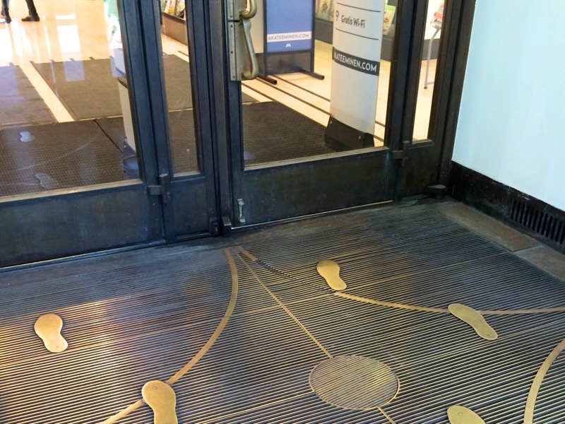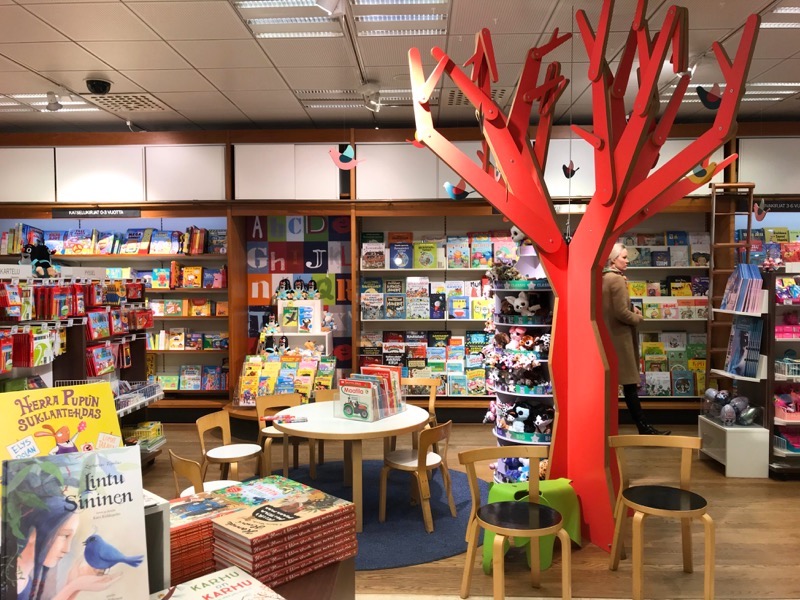 1階の書店奥にある児童書のコーナーでもartekの家具に親しみながら本が読めるようなキッズスペースがありますし、本屋の入り口には足跡のデザインも。子どもの頃からこのような本屋さんに通えるのは羨ましい限りです。ヘルシンキで隙間時間があれば、自然と立ち寄りたくなる本屋さんです。