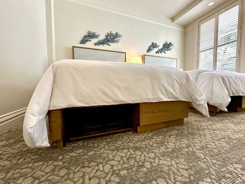 ベッドの下のトランク入れ。置き場に困るトランクですが、これは便利!