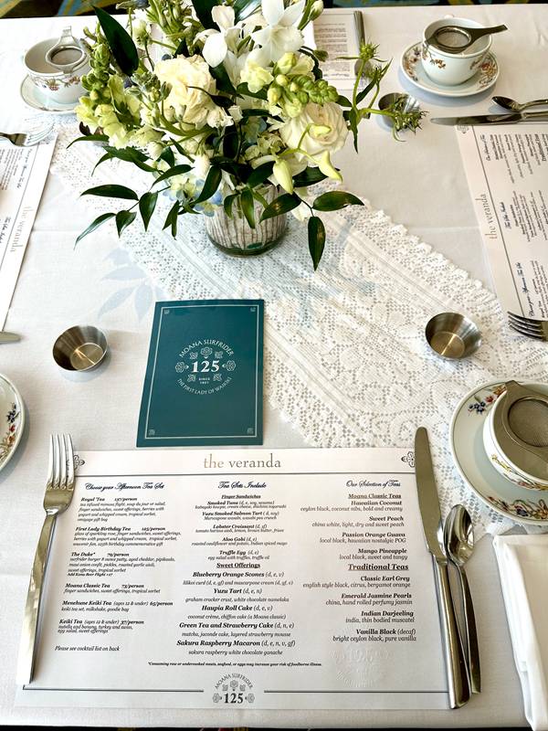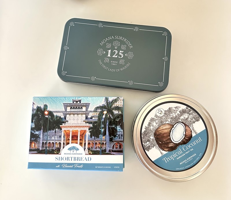 125周年記念のクッキーと、ホテルオリジナルのクッキー、それにアフタヌーンティーでセレクトされたトロピカルな味わいのブレンドティー。これらは「ザ・ベランダ」で購入できます。125周年の缶は今年しか手に入れられない限定品なので「モアナサーフライダー」好きの方はお見逃しなく!