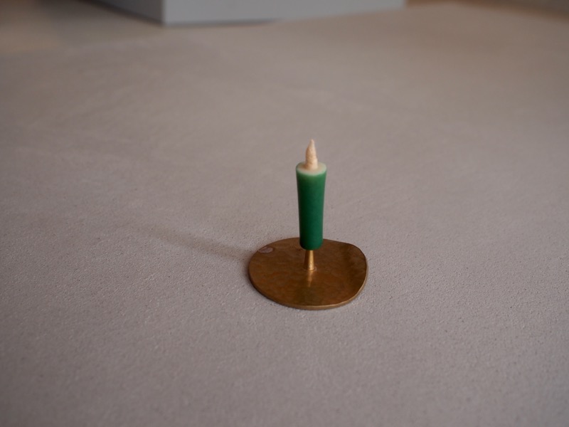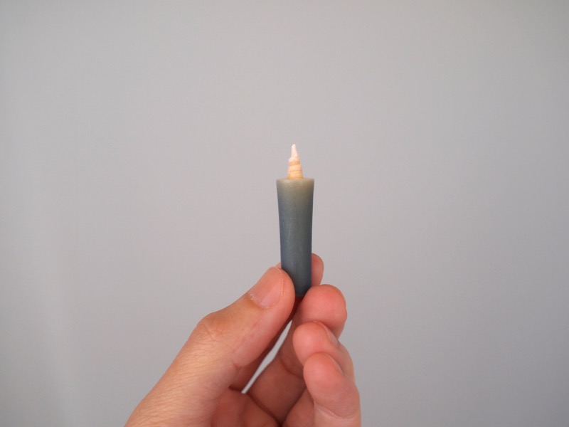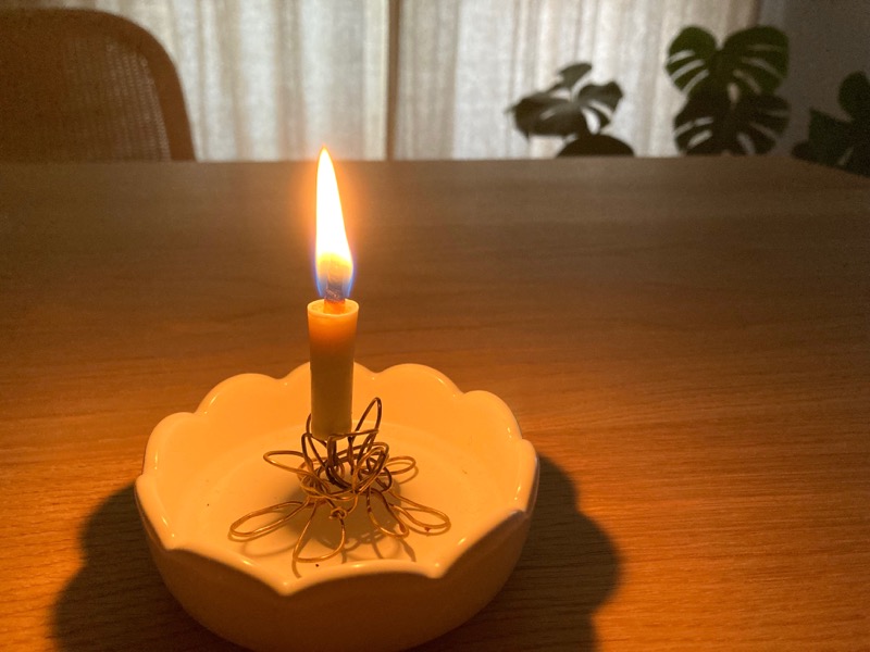 買って帰ったはいいけれど、キャンドルホルダーがなく、でもすぐに使ってみたかったので、急遽針金で制作。キャンドルホルダーができたはいいけれど、今度は火をつけるマッチやライターを持っていませんでした。(苦笑)