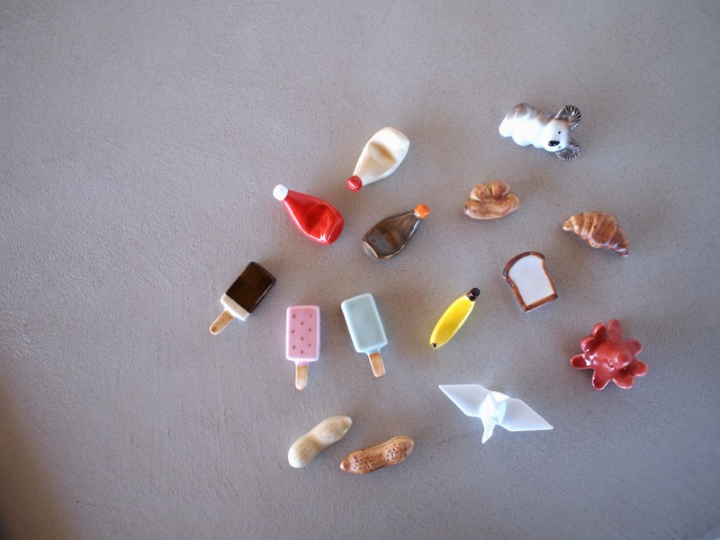 それがこちら。本物そっくりの調味料、アイスキャンディ、ピーナッツ、パンなどを模したユニークな箸置きたちです。