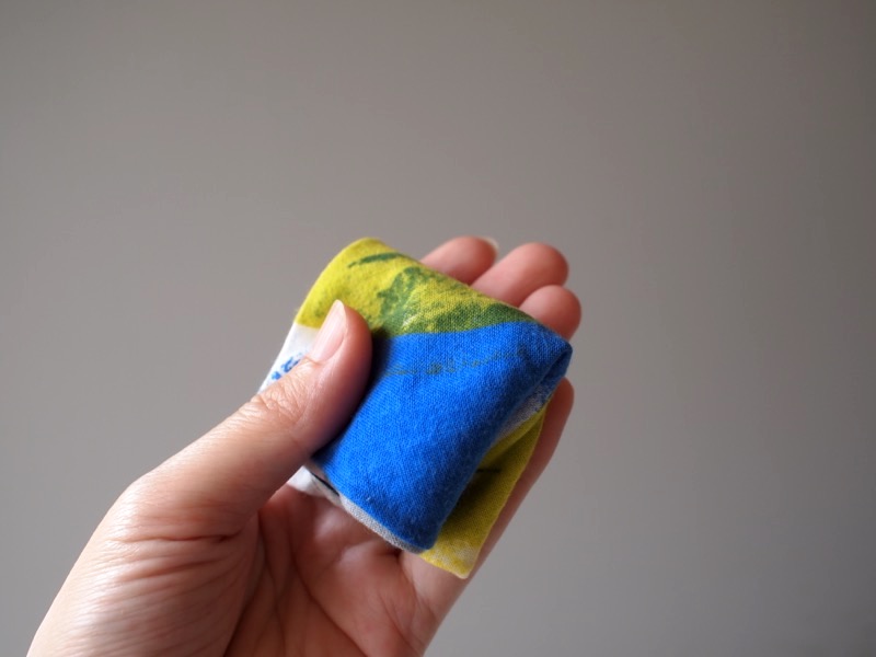 このおにぎり袋も同じです。小さなあずま袋のデザインになっていてかさばらず、たたむととってもコンパクト。おにぎりは小さめが3個、大きめのものだとちょうど2個入る大きさです。結んだ形も三角形とおにぎりの形になっていて、まさに“おにぎりのためだけにつくられた、おにぎりのためのおにぎり袋”なのです。