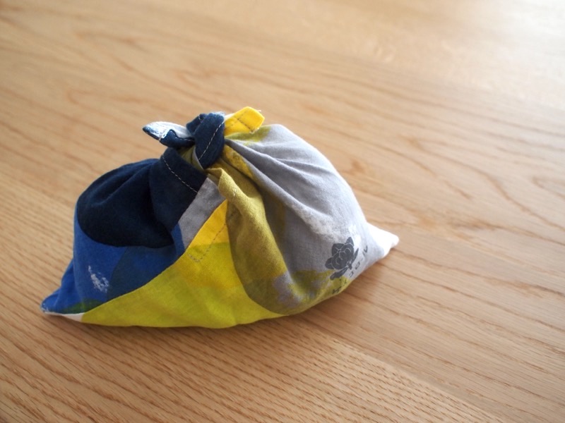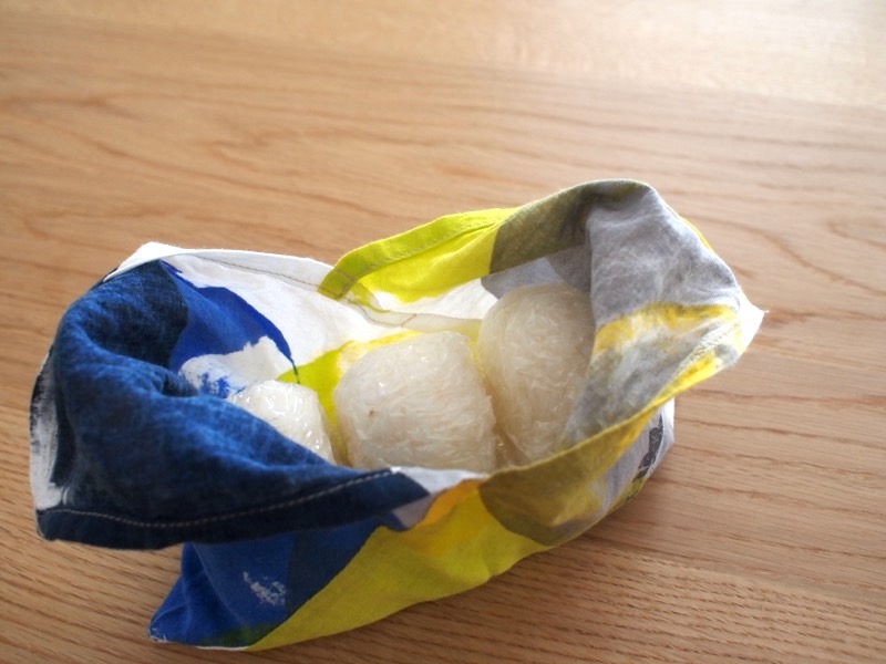 このおにぎり袋も同じです。小さなあずま袋のデザインになっていてかさばらず、たたむととってもコンパクト。おにぎりは小さめが3個、大きめのものだとちょうど2個入る大きさです。結んだ形も三角形とおにぎりの形になっていて、まさに“おにぎりのためだけにつくられた、おにぎりのためのおにぎり袋”なのです。