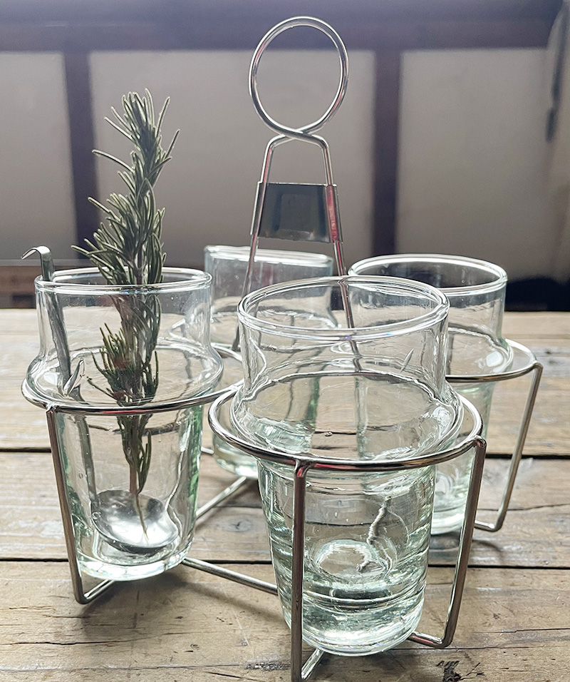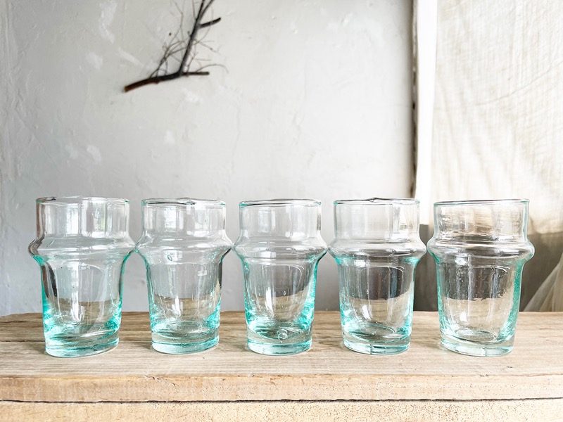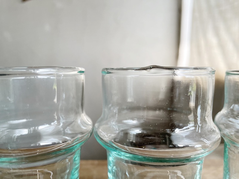 2日目の今日は、実店舗でも気づけば多くのお客様に選ばれている、手に取りやすいグラスをご紹介します。うっすら青緑がかった色と、ゆらぎのあるカタチが印象的なモロッコのグラスです。リサイクルガラスを溶かし、吹きガラス製法でひとつひとつ職人の手によって作られているため、同じように見えても、ぽってりとした口の厚みや気泡の入り方に個体差があります。その揺らぎは、まさに私が「愛くるしいグラス」と呼びたくなるような表情で、手仕事のぬくもりを感じさせてくれます。