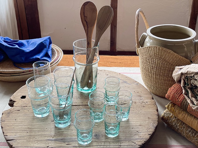 2日目の今日は、実店舗でも気づけば多くのお客様に選ばれている、手に取りやすいグラスをご紹介します。うっすら青緑がかった色と、ゆらぎのあるカタチが印象的なモロッコのグラスです。リサイクルガラスを溶かし、吹きガラス製法でひとつひとつ職人の手によって作られているため、同じように見えても、ぽってりとした口の厚みや気泡の入り方に個体差があります。その揺らぎは、まさに私が「愛くるしいグラス」と呼びたくなるような表情で、手仕事のぬくもりを感じさせてくれます。