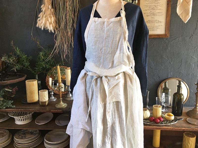 後ろでバッククロスに結び、頭からすぽんとかぶれる気軽さも、このデザインならでは。使い込むほどにやわらかく、体になじみ、日々の相棒のような存在になっていくのも嬉しいです。
