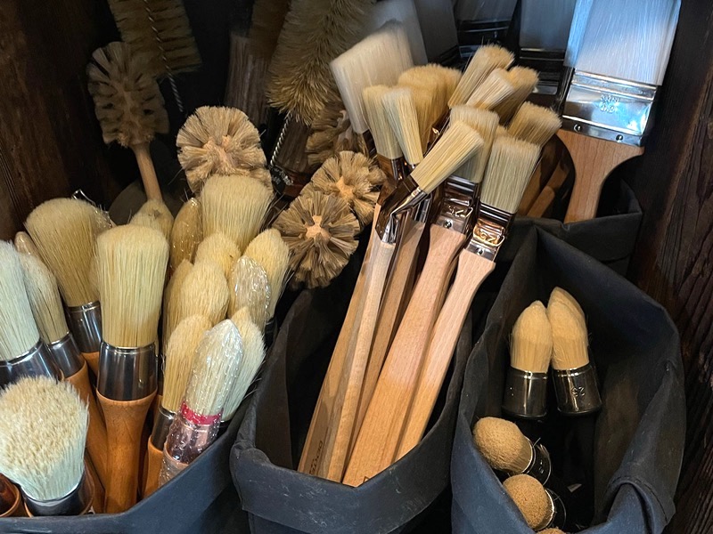 棚には、サイズも形も毛の種類も異なるブラシがずらりと並び、見ているだけで心が弾みました。「うわ、かわいい!何かに使えないかな?」とワクワクしながら眺めているうちに、気づけば何本も手に取っていました。しかも毛は天然の豚毛で、筆先を留めている金具の部分はなんと銅製!その質感と色合いに、思わず、こんなに美しいモノを掃除道具として使いたい!と、興奮してしまいました。