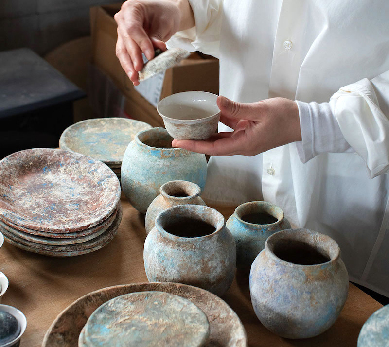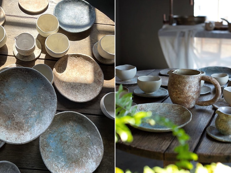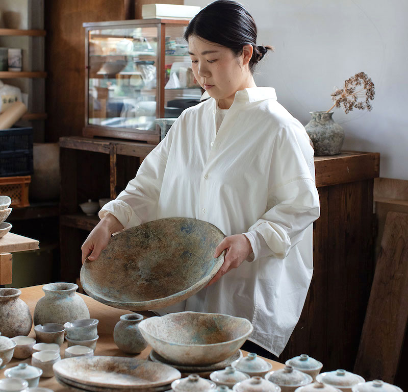 自然物や古物へのまなざしが深く反映された器たち。色は、土や山、植物、空。あるいは日常の中でふと目にした何気ない色を重ね合わせるように考え、形はあくまで自然の線。その姿勢は、見る人や使う人に「余白」を残し、生活の中でじわりと存在感を増していく不思議な魅力があります。