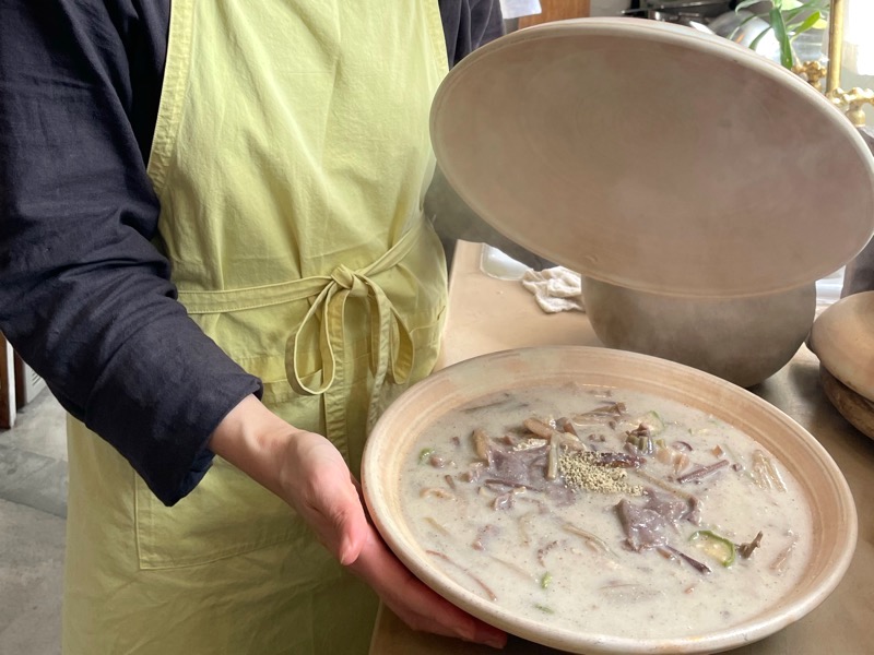 2024年2月には、弊店での個展に合わせ「韓国料理と韓国茶の会」を開催しました。直火耐熱の鍋を使い、その場で仕上げたお料理をお出しするという特別な試みです。韓国から4名のお客様が来日してくださったほか、全国各地からも故金さんの器をきっかけに多くの方が集まり、あたたかい時間が生まれました。