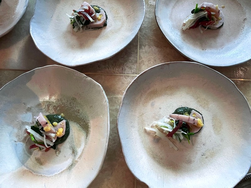 料理を担当してくださったのは、韓国在住の人気料理家・Yonaさん。韓国でも手に入りにくい食材や季節の恵みを巧みに組み合わせ、故金さんの器の中で、湯気や熱までも料理の一部として立ち上がらせるような美しい一皿を次々に生み出してくれました。