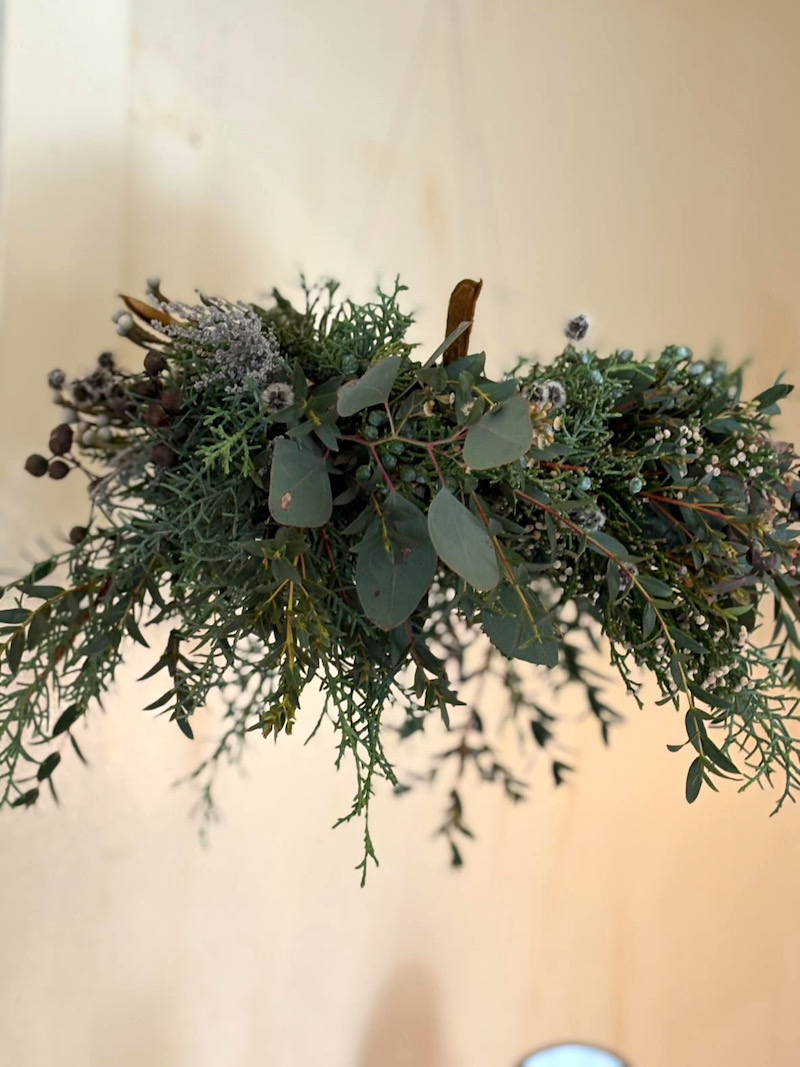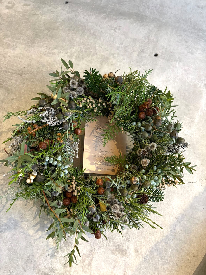 リースが届くと一気に店内の香りが変わ、森の中にいるようなそんな感覚に。