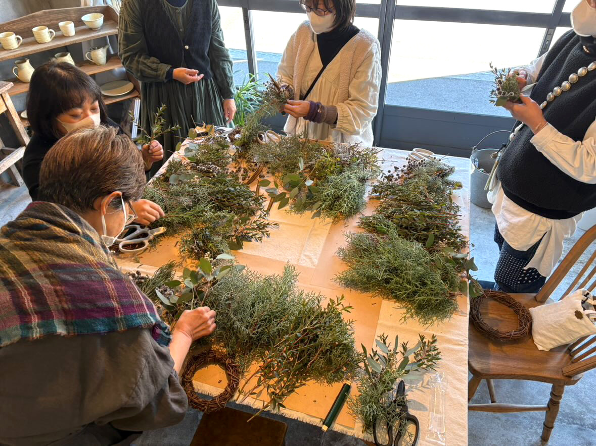 毎年開催されるリース講座は大人気。参加される皆さんは心躍らせ、そして少し緊張し講座に取り組んでいます。黙々と、たまに雑談しながら作り出すリースは個性光るものばかり。クリスマス時期にはもちろん一年を通して飾って楽しめる。