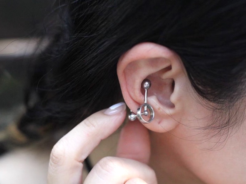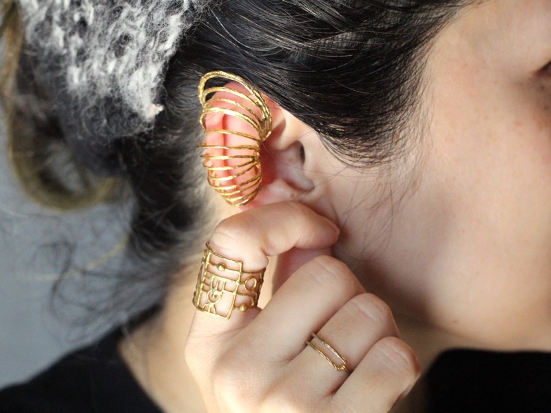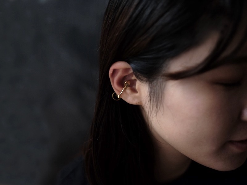 付ける向きによって雰囲気が変わるこの一癖が好きです。重ね付けが楽しめるところがイヤーカフの魅力です。ピアスを開けていない方にも人気です。線と円のイヤーカフは大・小あるので、お好みでお選びいただけます。