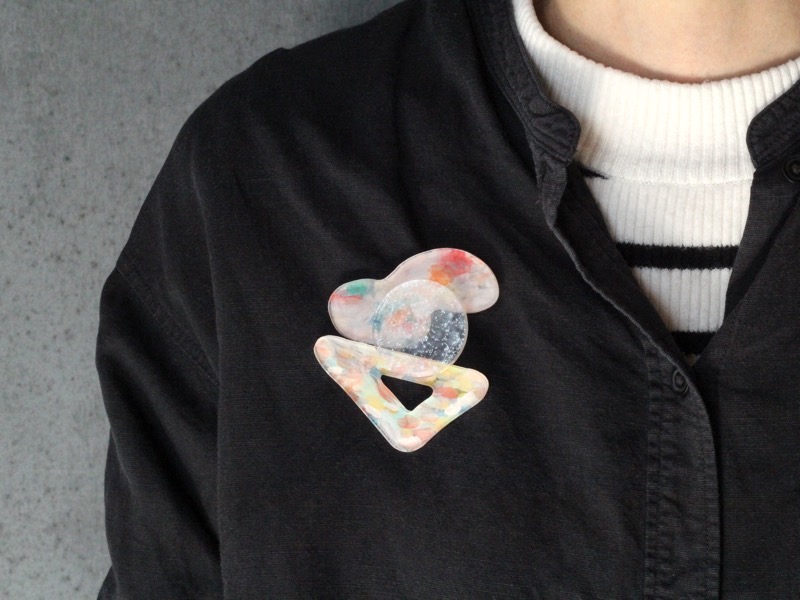suzukiさんのブローチは、アクリル板の上にアクリル絵具を重ねて描いていくブローチ。