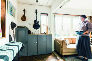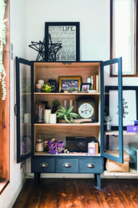 キャビネットはいつでも視界に入るソファ脇を定位置に。それまで飾りすぎていた雑貨をなくしたら、すっきり。