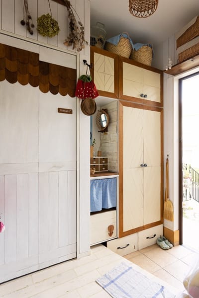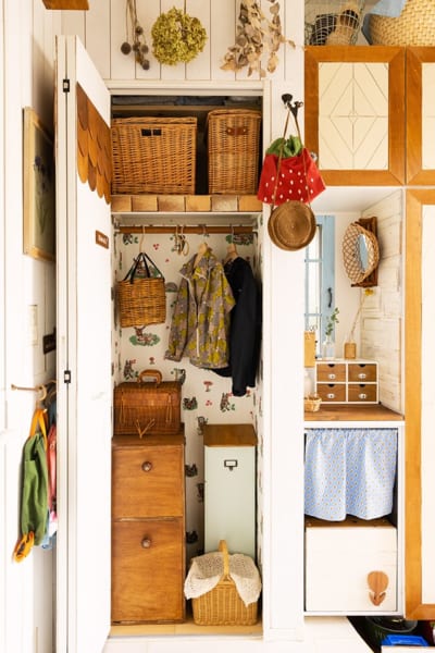 また、アウターや掃除道具などをしまうクロゼットは、 ナタリー・レテの動物柄の壁紙を張って楽しい雰囲気に。 今まではここにいろいろと詰め込んでいましたが、ものに合わせた収納家具を主人に作ってもらったら、すっきり可愛い空間になりました。それが見えるのがうれしくて、今では扉を開けっぱなしにしています。昼間も薄暗かった玄関が、すっかり見違えました。