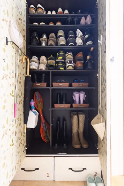 造り付けの靴箱は上段にいくほど出番の少ない靴を収納。子どもの長靴は下段の下半分に、水色カーテンの中にスニーカーを。