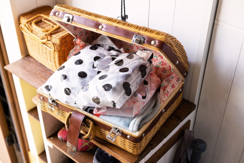 お手製の靴棚の上にかごを置き、レインコートをしまいました。