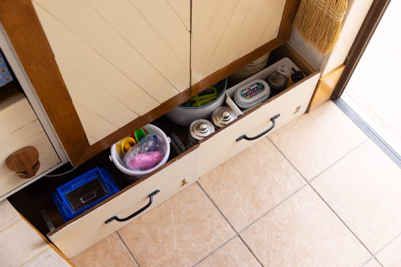 靴箱の下に引き出しを入れて、ガーデニング用品や戸外用の遊具の収納に。