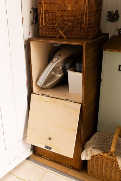 木箱の上段にはハンディクリーナー、下段には自転車のバッテリーを収納。