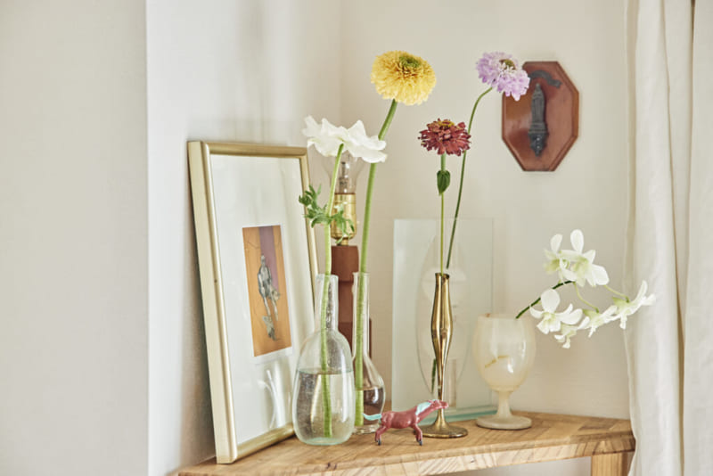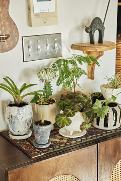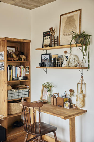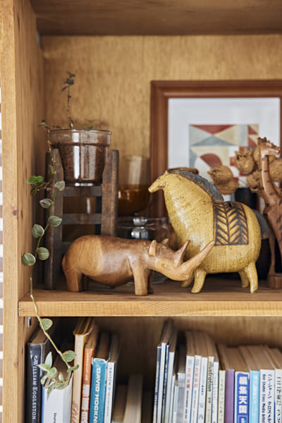 自分がどんなものが好きかをあらためて俯瞰して見えてきたのが〝愛きょう〟。少し形が変わっていたり、いびつだったり。それは、一つひとつに形づくられた 〝揺らぎ〟みたいなもの。ちょっとはみ出したところに人間味が出るような気がして。そんな一点ものとの出会いを探して骨董市や古道具店に足しげく通うようになりました。ぴったりなものに巡り合えた瞬間は、なんともいえない高揚感があります。巡り合わせ自体が熱量としてものに刻まれ、愛着がわくんです。 こんなふうに自分の好きを集めたのが今の部屋。ときめく気持ちに素直になって好きを重ねたら、インテリアにも自分らしさがにじんできて。私が人でもものでも心ひかれるのは、どうしようもなくにじみ出る愛きょう。だからこそ、自分もそうでありたいんです。