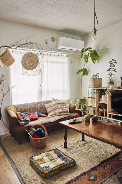 木の家具や竹のかごなどナチュラルな素材中心の茶系ベースなわが家。そこにラグや布ものでビビッドな差し色を組み合わせるのが好き。海外のカラフルな民芸品がなじみます。